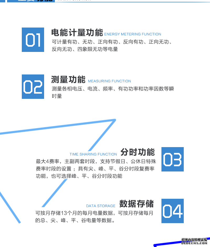 - 主要功能:有功,功率因素,有功功率,無功功能,四象限無功,電壓,電流,事件報警