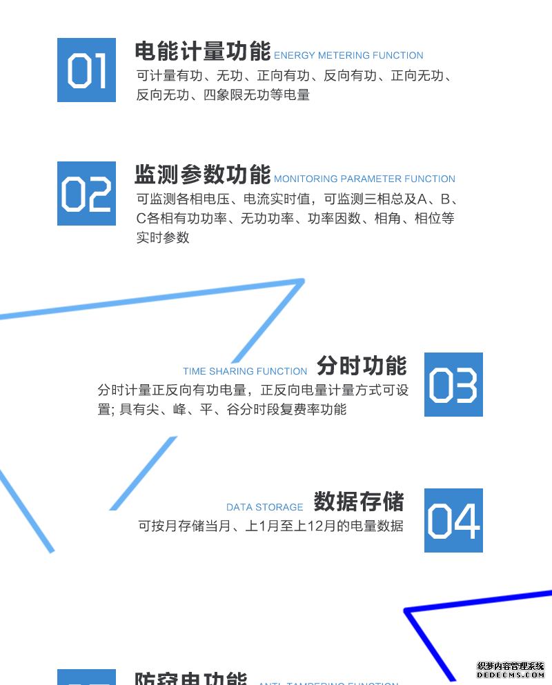 - 主要功能:有功,功率因素,有功功率,無功功能,四象限無功,電壓,電流,事件報警