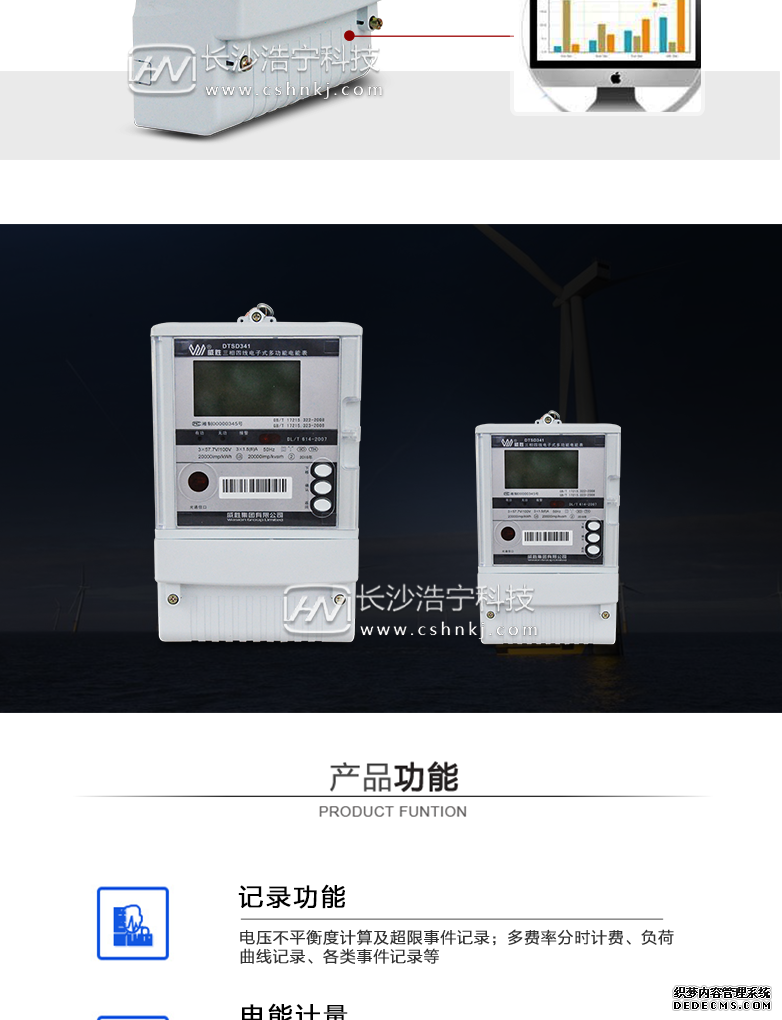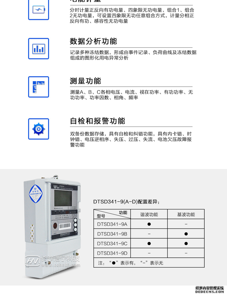- 主要功能:有功,功率因素,有功功率,無功功能,視在功率,四象限無功,電壓,電流,事件報警,載波,費控,需量,諧波